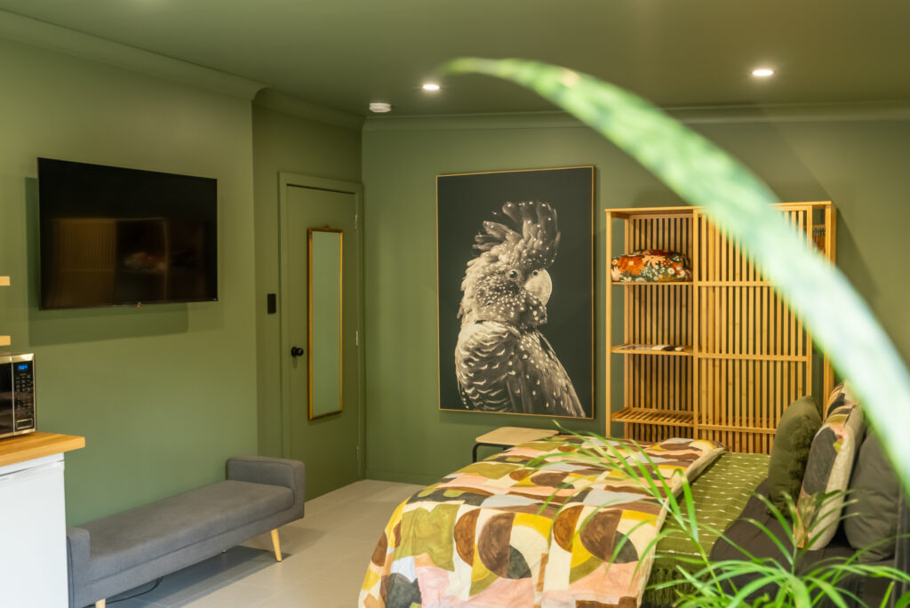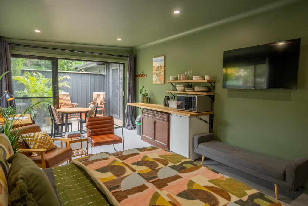 The studio is a large 25m2 room, suitable for up to two adults. The kitchenette has a bar fridge, kettle, microwave, and toaster. The room has insulation in the walls, ceiling, and floor – making our split-cycle air conditioner even more effective when heating/cooling the space while minimising external noise.